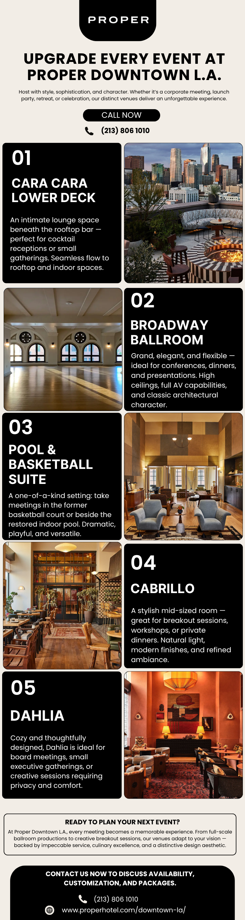 Discover distinctive event spaces at our Downtown Los Angeles hotel, where history, design, and versatility meet. From the rooftop charm of Cara Cara’s Lower Deck to the grandeur of the Broadway Ballroom, each venue sets the stage for unforgettable experiences — corporate or social.